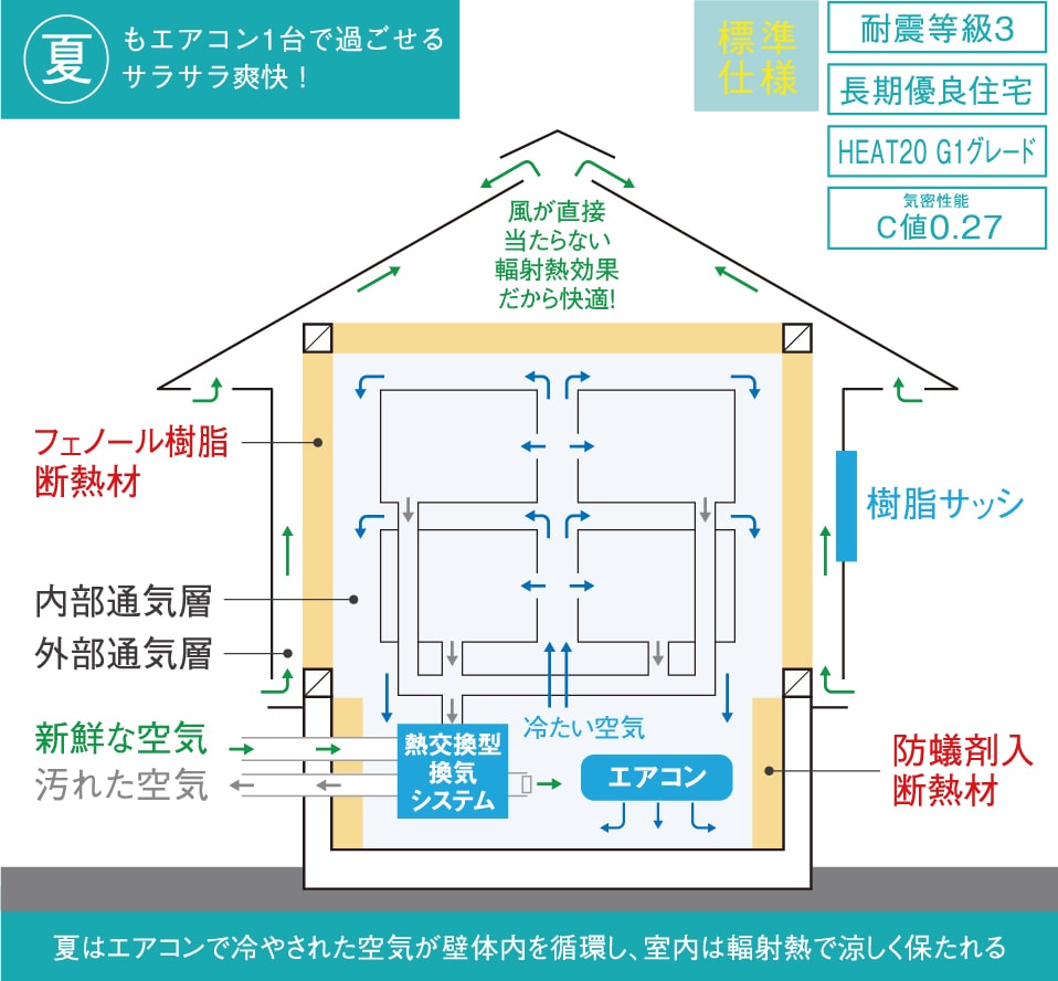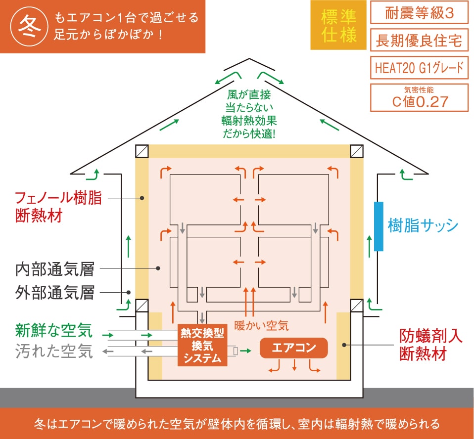「トリプルA工法」では、床下に設置した家庭用エアコンの風を、壁内部の通気層を通して家全体に循環させます。輻射熱の効果で室内を均一に暖めるため、家中どこにいても快適に過ごせます。エアコンの風が直接当たらず、乾燥もしにくいため、健康面でも安心。家庭用エアコン1台で家全体の空調がまかなえるため、光熱費もグッと抑えることができます。