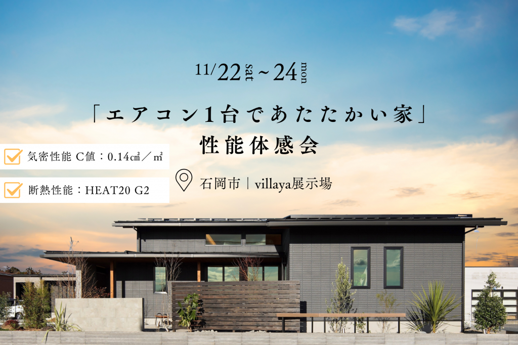 「エアコン1台であたたかい家」性能体感会を、villaya(ヴィラヤ)展示場にて開催します。高気密・高断熱のトリプルA工法を採用し、冬の明け方は氷点下6℃まで下がる石岡市でも家庭用エアコン1台で快適に暮らせる魔法の家です。天井高3.5mの開放感ある平屋設計や、暮らしに寄り添う回遊動線・ランドリースペースなども併せてご体感ください。数字では分からない“快適さ”を、その肌で確かめるまたとない機会です。