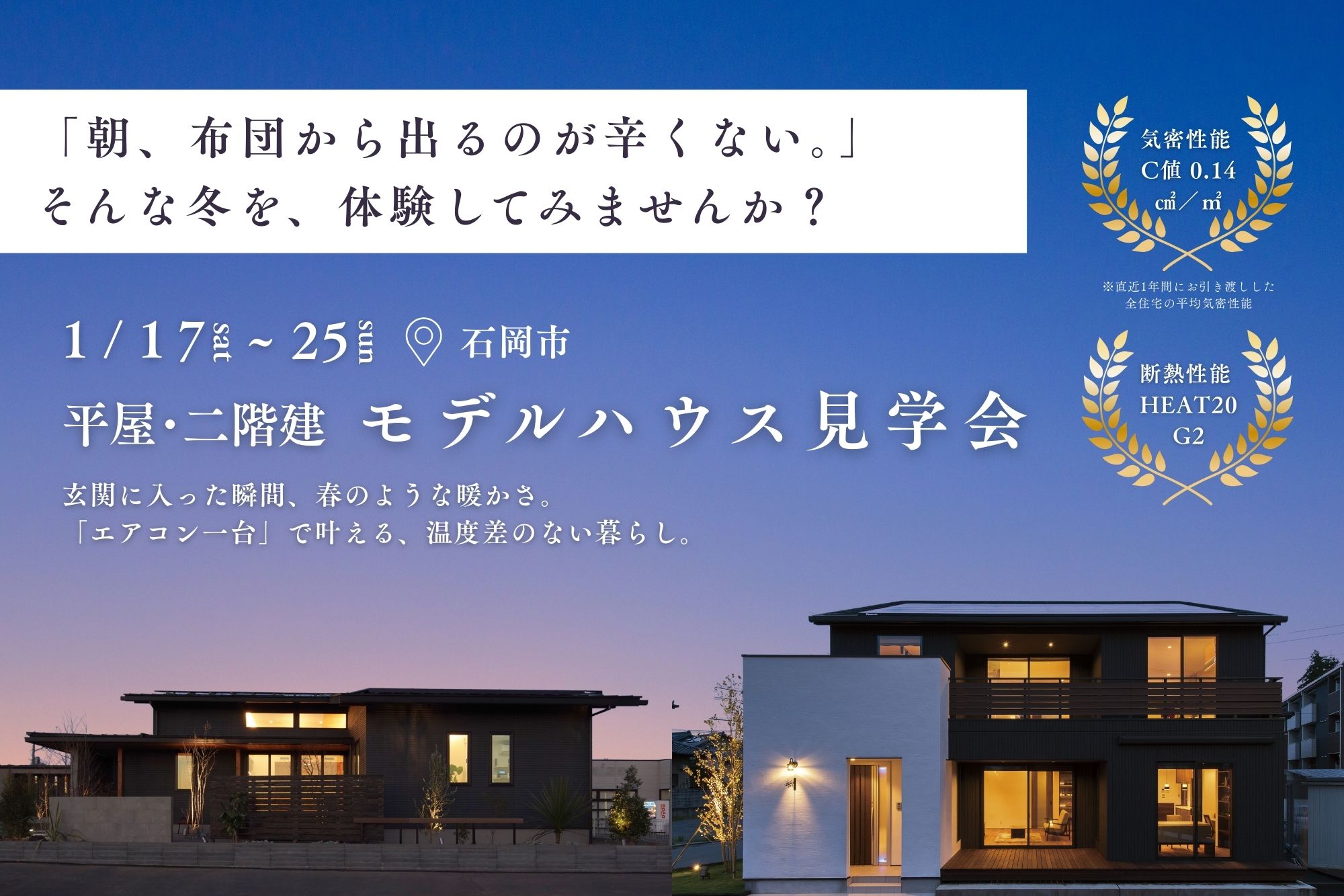 「エアコン1台」で叶える、温度差のない暮らしを体感できるモデルハウス見学会を、ヴィラヤ展示場(平屋)とショコラ展示場(二階建て)にて二物件同時開催します。どちらも高気密・高断熱のトリプルA工法を採用し、冬の明け方は氷点下6℃まで下がる石岡市でも家庭用エアコン1台で快適に暮らせる魔法の家が完成しました。数字だけでは語れない“快適さ”を、その肌で確かめるまたとない機会です。