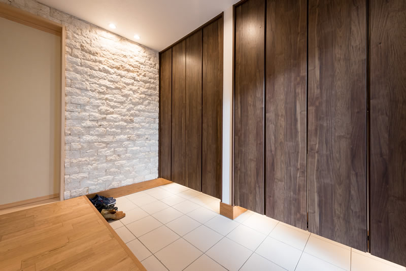 それから、モデルハウスを見た時からとても気に入っていた玄関。石の壁が豪華で、広い空間と大きなシュークローゼットは使いやすさも最高です。ものすごく気に入っています。