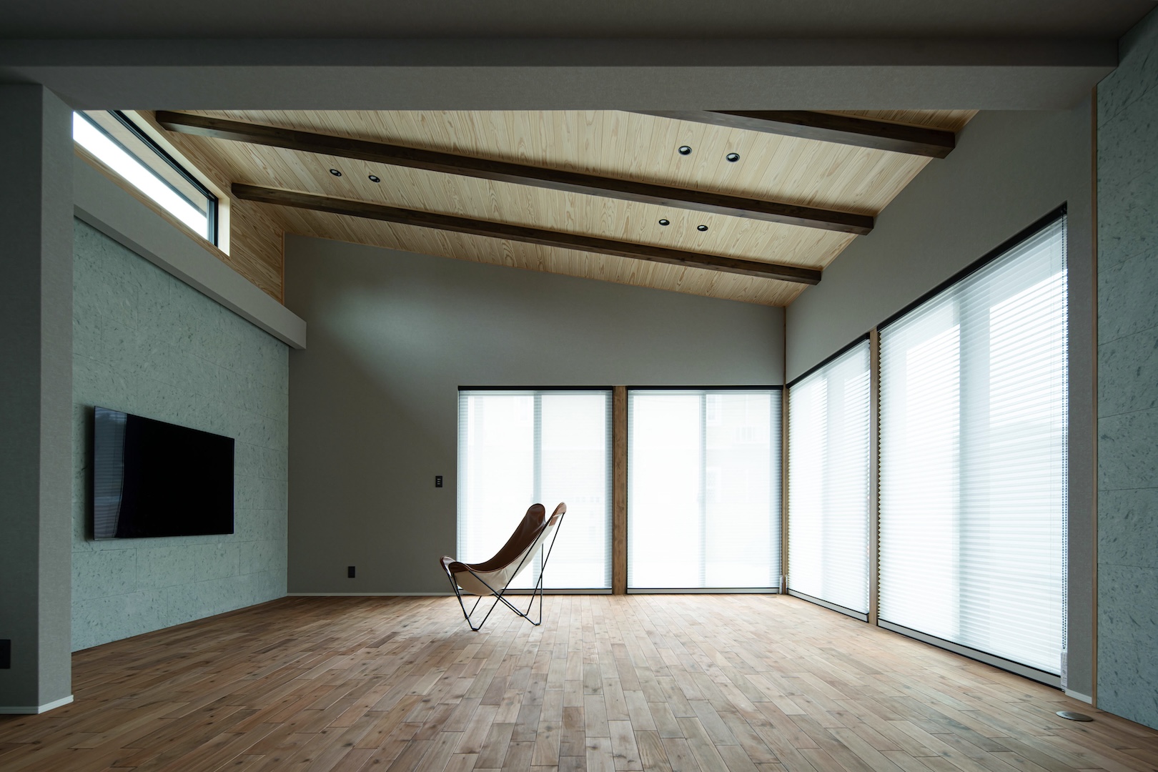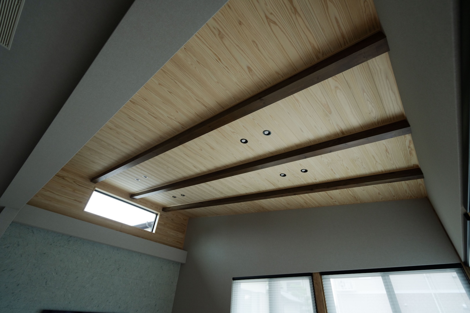 天井にはアヤプラスハウスこだわりの純白羽目板を採用。 そして壁面には、なんと「籾殻(もみ殻)」が練り込まれた特殊な壁紙があしらわれています。 職人の高い技術が求められるこの壁紙は、独特のマットな質感と手触りが特徴。自然素材の温もりが、空間に深みと落ち着きをもたらしています。