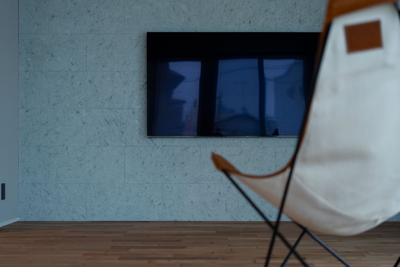 リビングに入ってまず目を奪われるのは、テレビ背面に設えられた淡いグリーンの天然石。 当初は大谷石を検討されていましたが、最終的に選ばれたのは希少な「十和田石」でした。